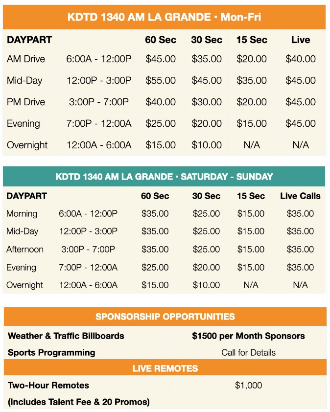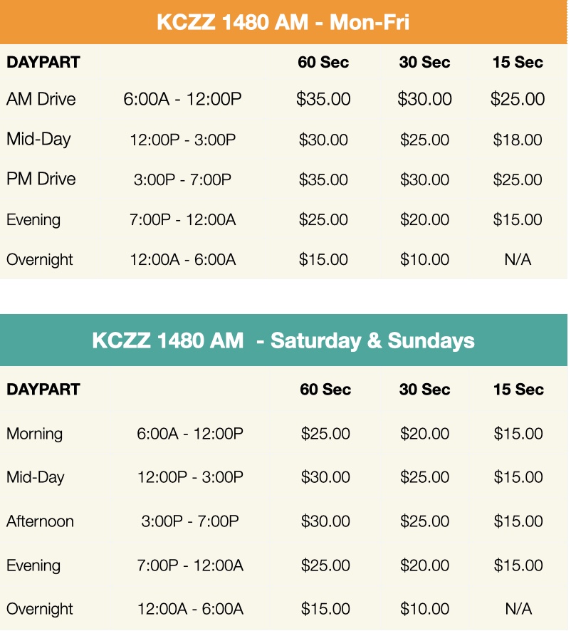 Monday – Sunday | KCZZ 1480 AM | KDTD 1340 AM | KYYS 1250 AM |
