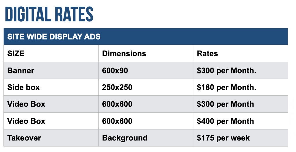 Web ads are organized into 2 groups, Homepage ads, and Interior page ads. Ads must be submitted in 72 dpi as JPG, PNG, or GIF file types. Flash ads and embedded HTML5 can also be submitted with 7 days’ advance notice for testing. Site takeovers and video boxes are available as well.